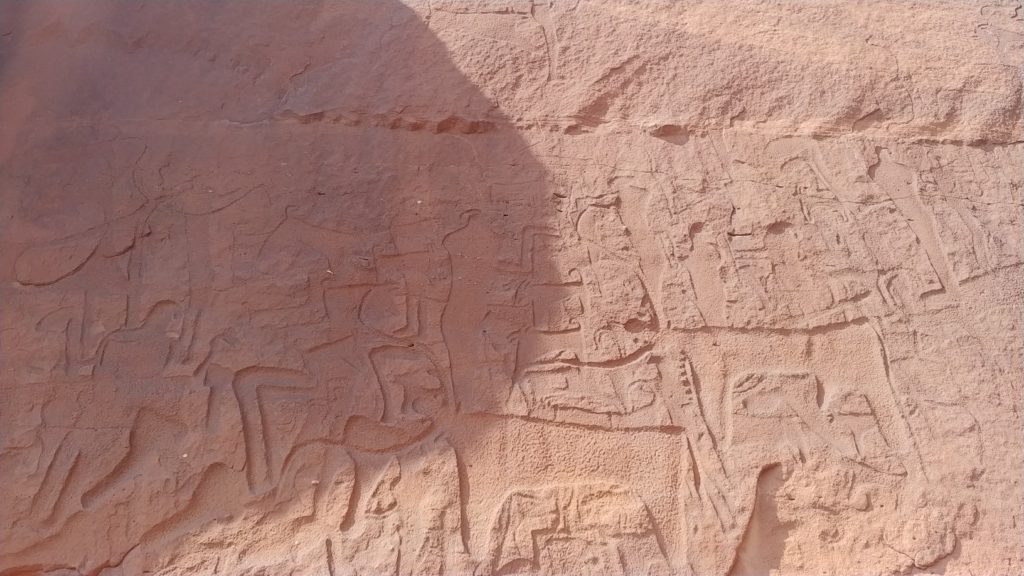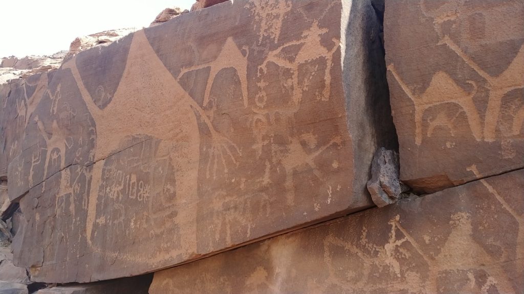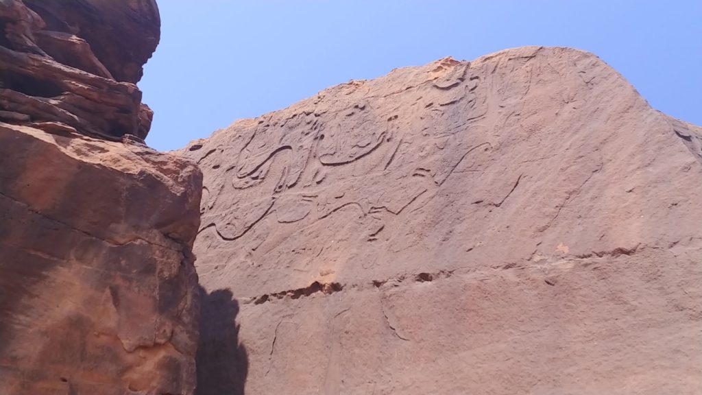 Málokterá oblast je tak bohatá na nálezy skalních kreseb a nápisů, jako právě Saúdská Arábie. Vedle jižních oblastí poblíž Nadžránu to je právě i oblast Shuwaymis na severu, kam míříme. Dostat se k nim ale opět náležitě prověří našeho Nissana, který se ale v terénu choval jinak, než by člověk čekal od auta 4×4. Problém byl ale brzy identifikován. Nejednalo se o žádnou čtyřkolku, ale pouze o předokolku… A to i přes to, že půjčovna inzerovala vůz jako 4×4 a při přebírání potvrdili, že to je 4×4. Asi nevědí, co znamená 2WD ve specifikaci vozu… No co už, budeme si s tím muset nějak poradit teď i v následujících dnech. Ještě že druhý vůz je opravdu 4×4 a tažné lano to jistí.