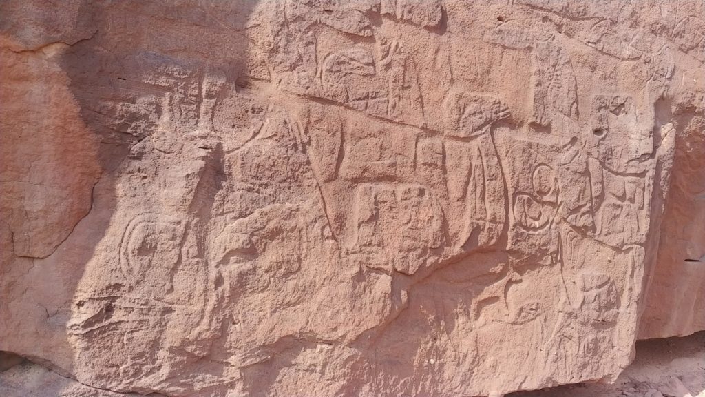 Peteroglyfy jsou skalní kresby, později i nápisy, vyryté do vrchní tmavší vrstvy horniny, v našem případě pískovce. Rytina časem rovněž na povrchu tmavne a díky tomu lze odhadovat jejich stáří. Ty nejstarší byly vytvořeny před 10 tisíci lety, ještě v dobách, kdy zde nebyla vyprahlá poušť. Zobrazují nejčastěji zvířata, která se tu s lidmi vyskytovala, jako krávy, velbloudy, pštrosy, lvy nebo lidské postavy. Naleziště je tak rozsáhlé a významné, že bylo zapsáno do seznamu UNESCO. Lokalita byla oplocena a uzavřena. To je zde častý způsob ochrany památek – oplotit a zamezit vstupu, aby se někomu něco nestalo nebo se památka nepoškodila. Naštěstí díra v plotě se většinou najde. Horší to bývá s nekompromisními strážci.